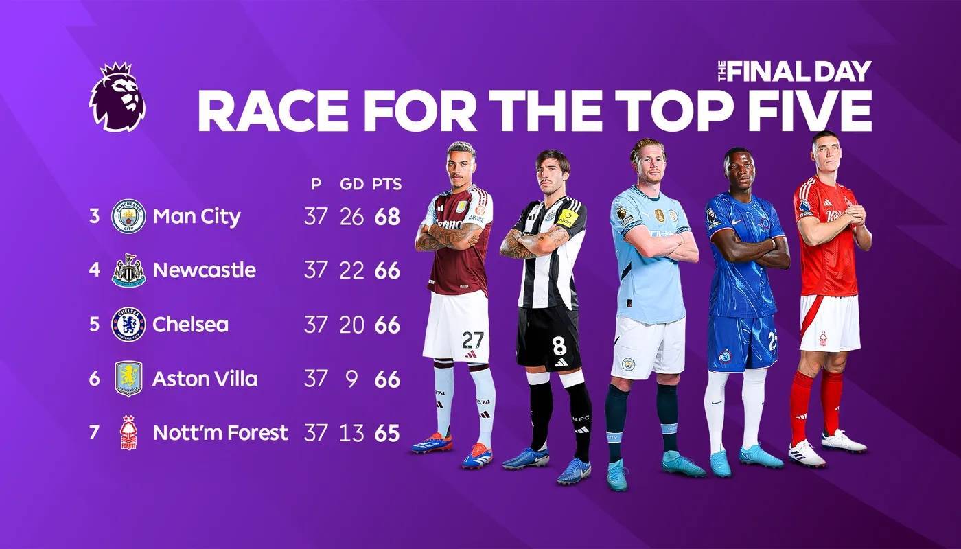 直播吧05月25日讯 今晚英超将迎来赛季收官,曼城、纽卡、切尔西、维拉、诺丁汉森林5支球队将争夺剩余的三个欧冠资格,BBC从经济角度,分析了晋级欧冠的收益。
